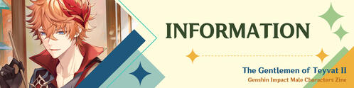 ✧✧ ABOUT ✧✧Do you love the male characters from the game? No matter if they’re from Mondstadt, Liyue, Inazuma or Sumeru, or even from the Fatui, it’s difficult to not like these characters! (Well, perhaps Reckless Pallad is an exception.) THE GENTLEMEN OF TEYVAT is a fanzine featuring all these wonderful characters!There are already a number of general, women-centric, and character-focused Genshin zines, so we are trying to make one which is slightly different but still fits the general Genshin theme. While the zine's focus is on the male characters, female characters are allowed to play cameo roles in the pieces! (Like, we need emergency food Paimon :3)And now we are at Volume II of the project thanks to the support from Travellers all over the world during Volume I. Volume II will focus more on Inazuma and Sumeru, but we are still including gentlemen from other parts of Teyvat!✧✧ INFORMATION DOCUMENT ✧✧Click the image below to access the info doc!